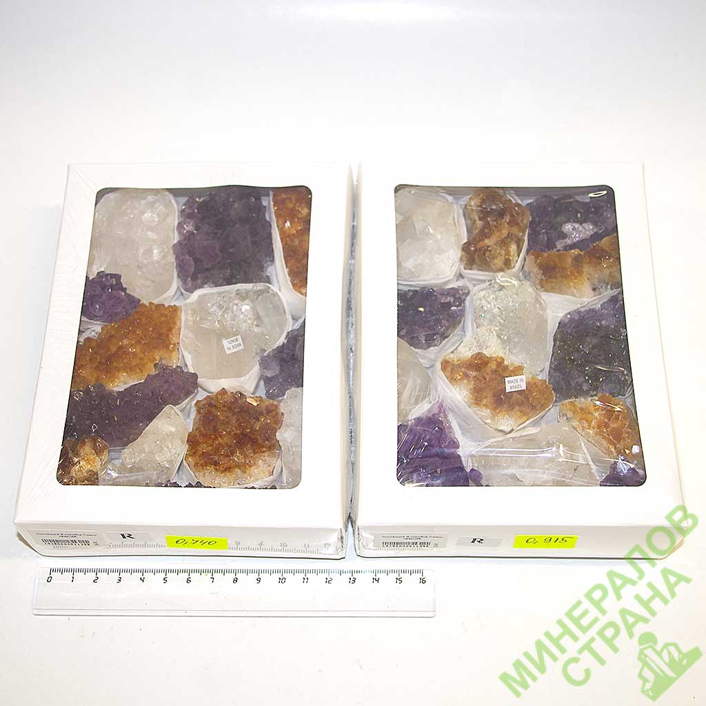 Коллекция кварцев в коробке. В данной коллекции содержатся следующие кварцы: аметист, горный хрусталь и цитрин. Размер коробки 17,5х13 см.Вес этой коробки 0,770 кг.Вес коробок может отличаться.Эти образцы продаются коробками.
