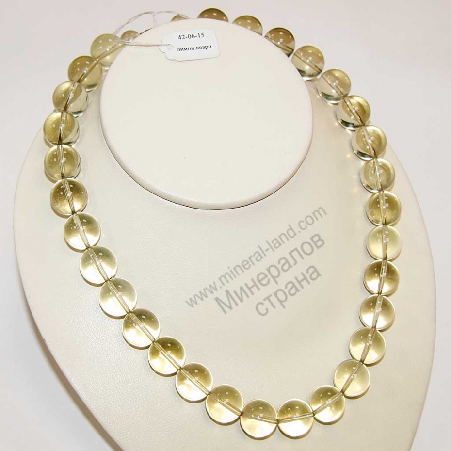 Бусы из лимонного кварца. Шарик 15мм. Артикул 42-06-15. Основа - леска. Латунный замок с резьбой.