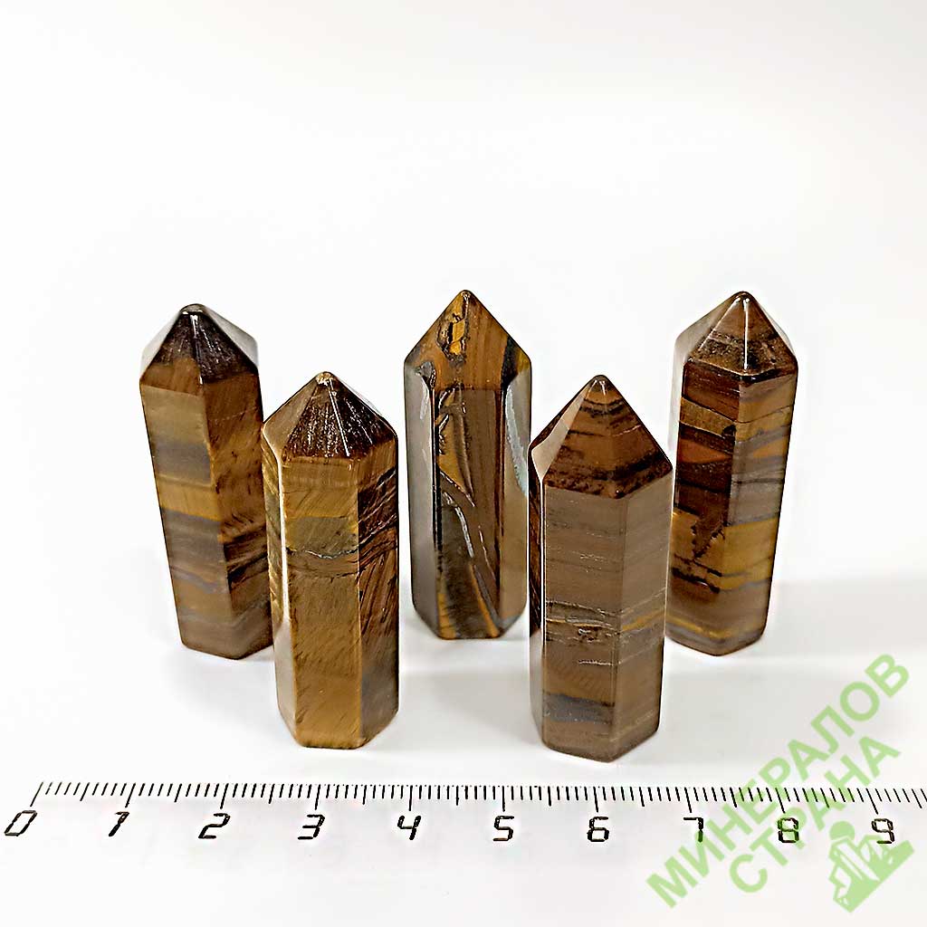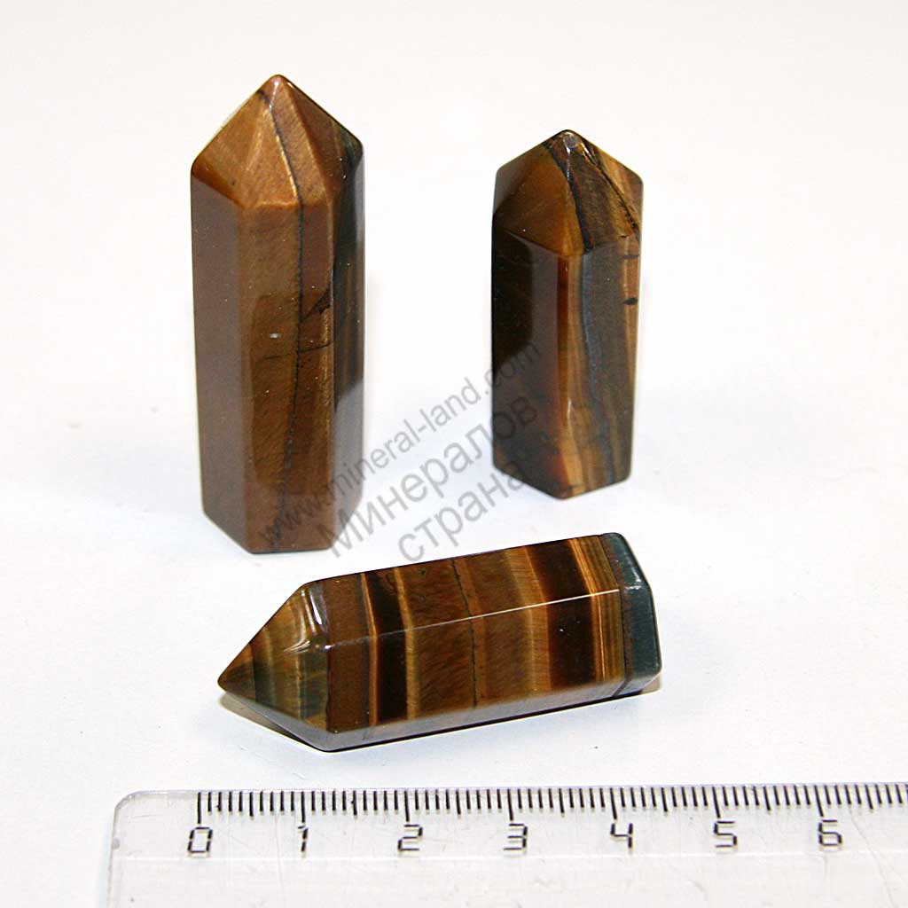 Тигровый глаз. Кристалл со спиленным основанием, в форме заостренных столбиков-кристаллов в среднем от 5 до 15 см.