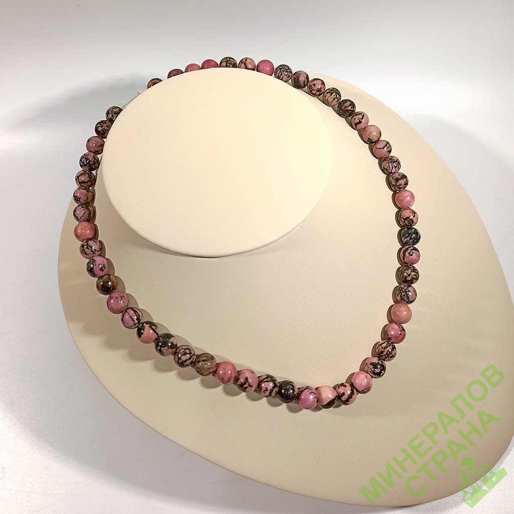 Бусы из родонита. Шарик 8 мм. Основа - леска. Латунный замок с резьбой. Длина нитки примерно от 44 см.